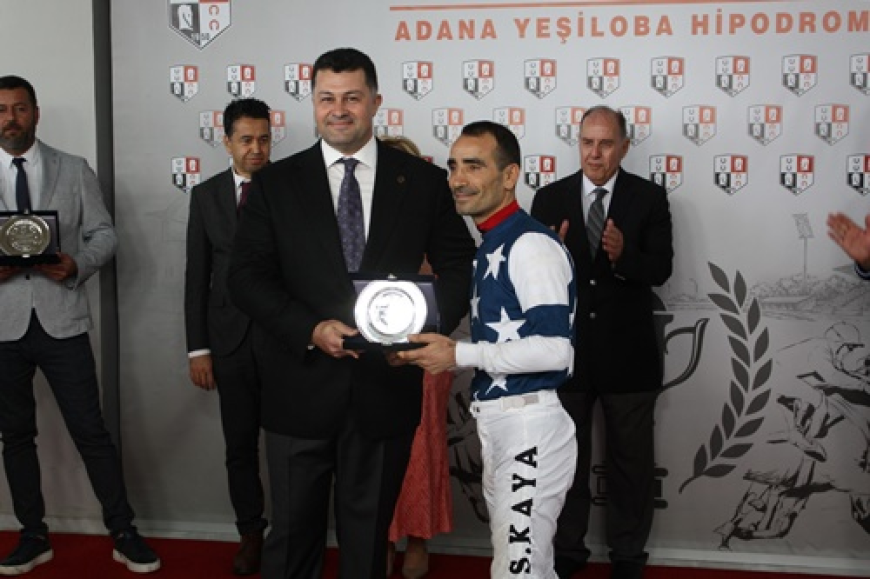 Başarılı jokey Selim Kaya'ya plaketini TJK Yönetim Kurulu Üyesi Halid Milli takdim etti.